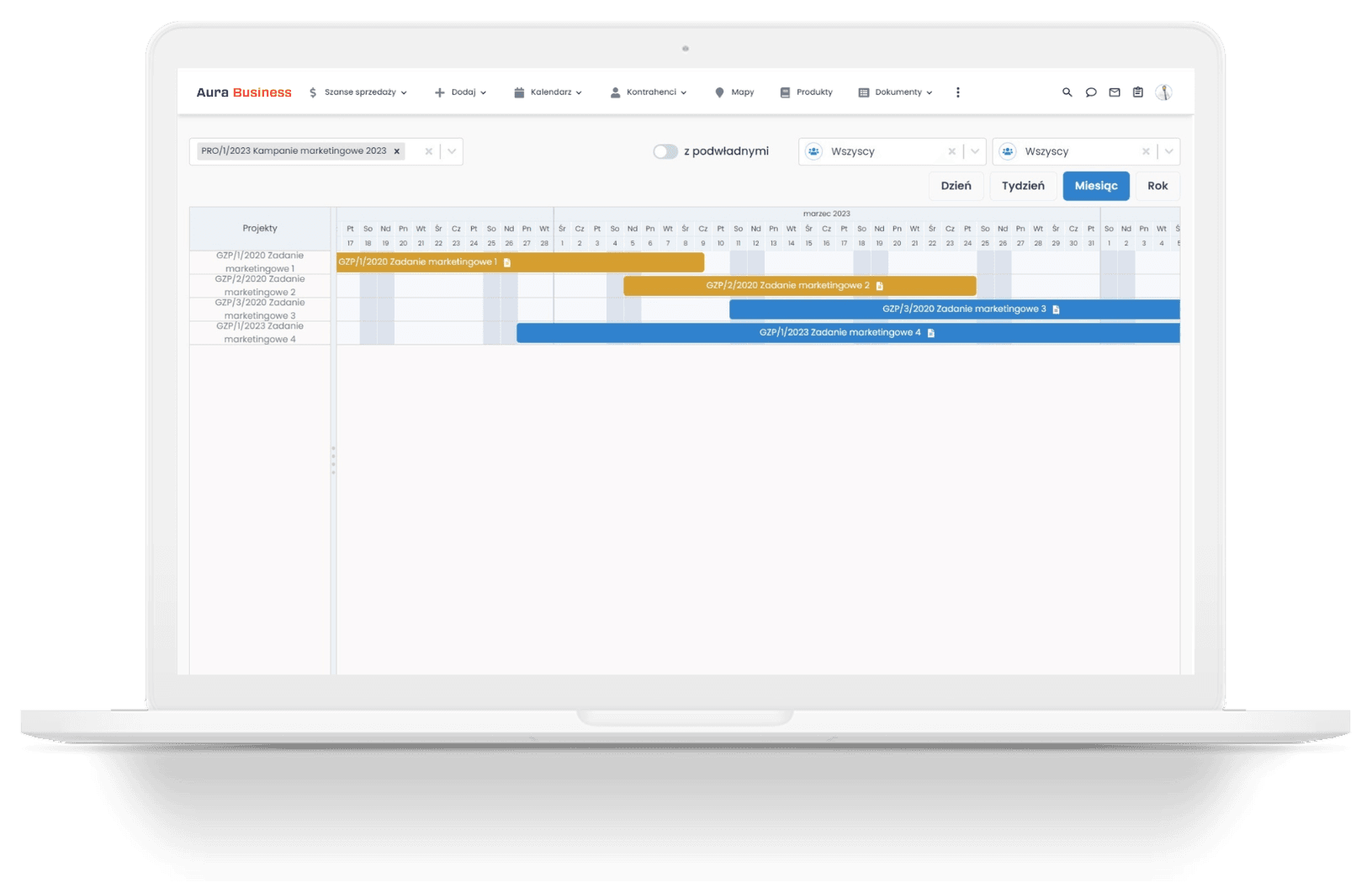 Aura Business wspiera zarządzanie projektami w metodykach Agile oraz Waterfall. Umożliwia zarządzanie zarówno wewnętrznymi projektami firmy, jak i zewnętrznymi (np. klientów). System oferuje rozbudowane narzędzia do zarządzania projektami. Warto spośród nich wyróżnić m. in. Widok Kanban. Jest to graficzny sposób prezentacji przepływu pracy w projekcie. Celem jego wykorzystania w codziennym funkcjonowaniu przedsiębiorstwa jest eliminacja marnotrawstwa zasobów oraz zapewnienie ciągłości pracy. Widoki Kanban w rozwiązaniu Aura Business pomagają kierownikom planować zadania pracowników, monitorować je i ustalać ich priorytety. Pracownicy zyskują dzięki temu łatwy dostęp do zadań, które mają wykonywać w zaplanowanej kolejności.