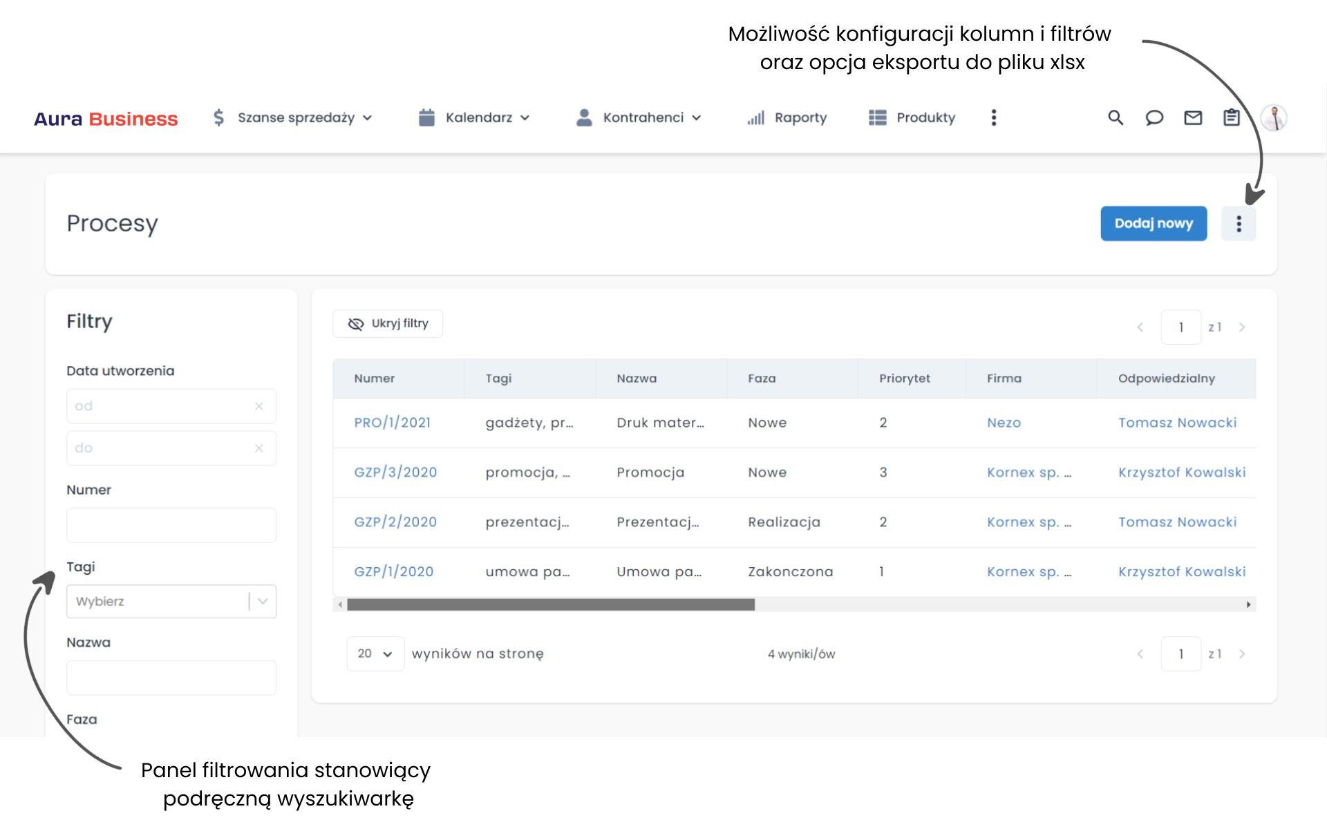 Trwające oraz już zakończone projekty możesz podejrzeć również na jeszcze jednym funkcjonalnym widoku. Dowolnie konfigurowana lista projektów stanowi bazę wiedzy o wszystkich procesach tego typu. Dzięki możliwości konfiguracji kolumn przedstawia tylko te informacje, które w rzeczywistości są potrzebne pracownikom, a samodzielnie budowany panel filtrowania znacznie przyspiesza wyszukiwanie konkretnych projektów.